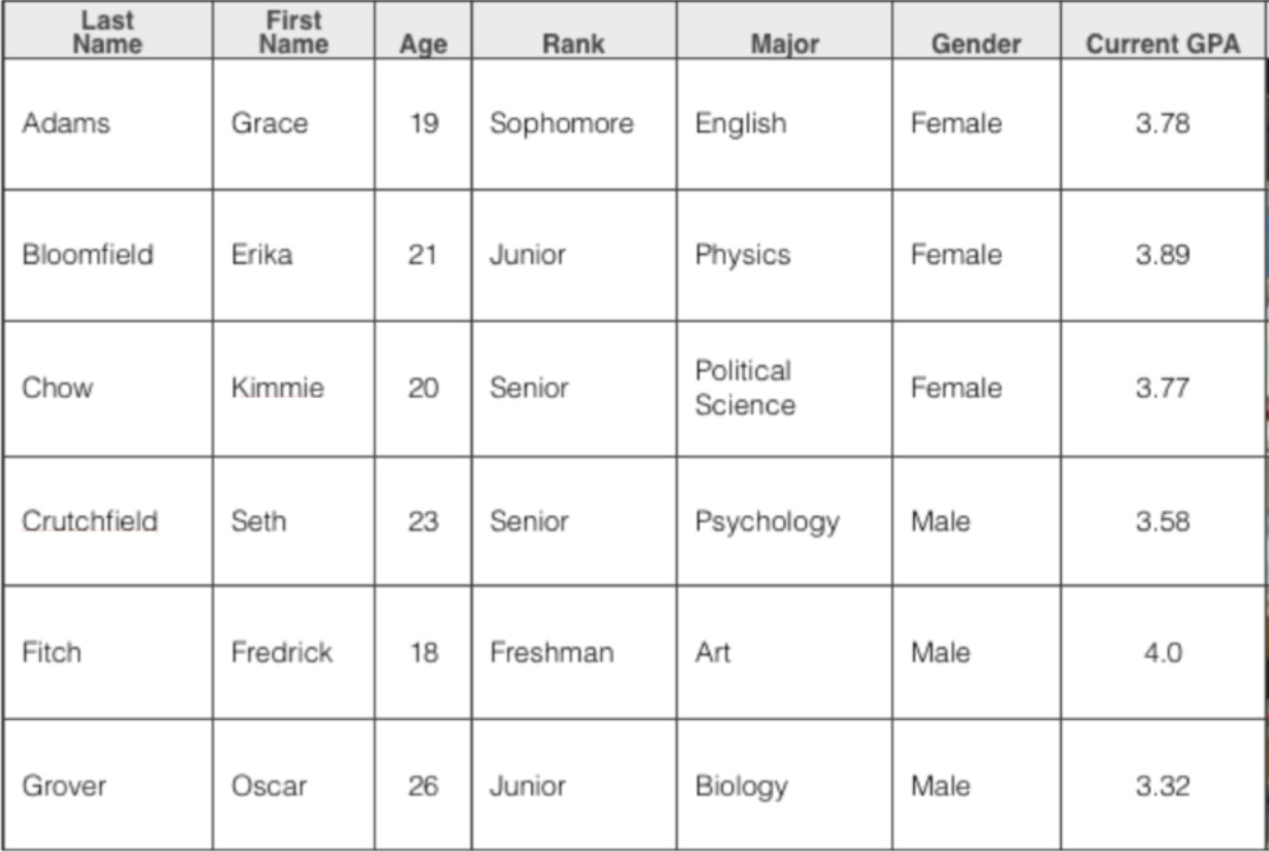 Take a quick look at the example table below. Another way we could display the table’s numerical information is in a graphic format —listing the students’ ages or GPAs on a bar chart, for example, rather than in a list of numbers. Or, all the information in the table could be displayed instead as a video of each student giving those details about themselves.
